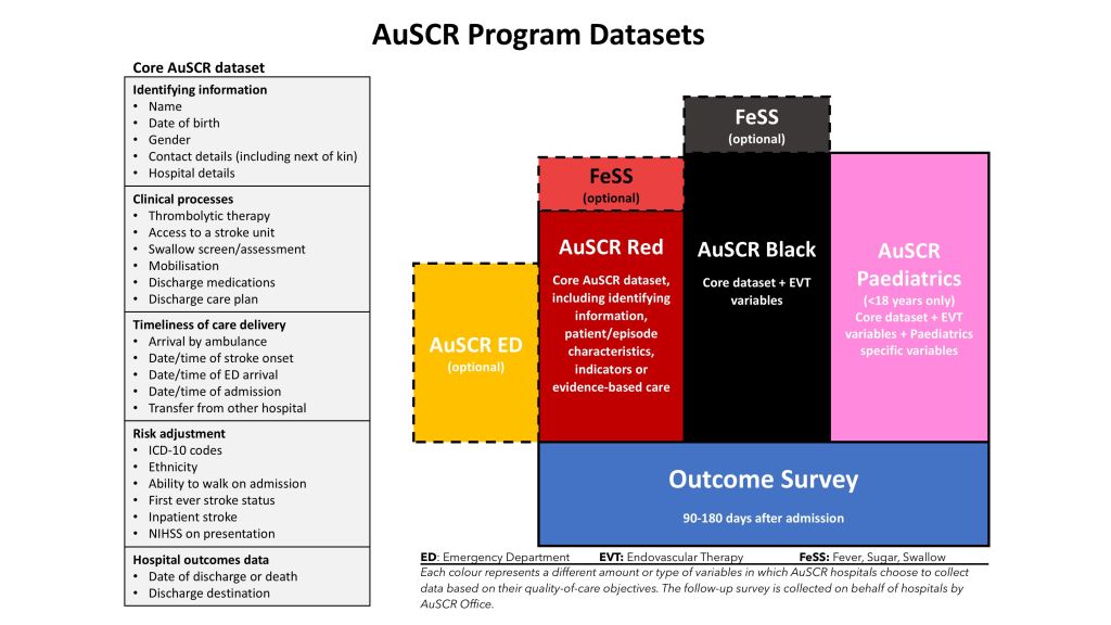 The Australian Stroke Clinical Registry (AuSCR) is a clinical quality registry designed to monitor and improve the quality of acute stroke care. It is a prospective, multi-centre database collecting data on the demographics, presentation, diagnosis, treatment and outcomes of hospitalised patients with stroke.